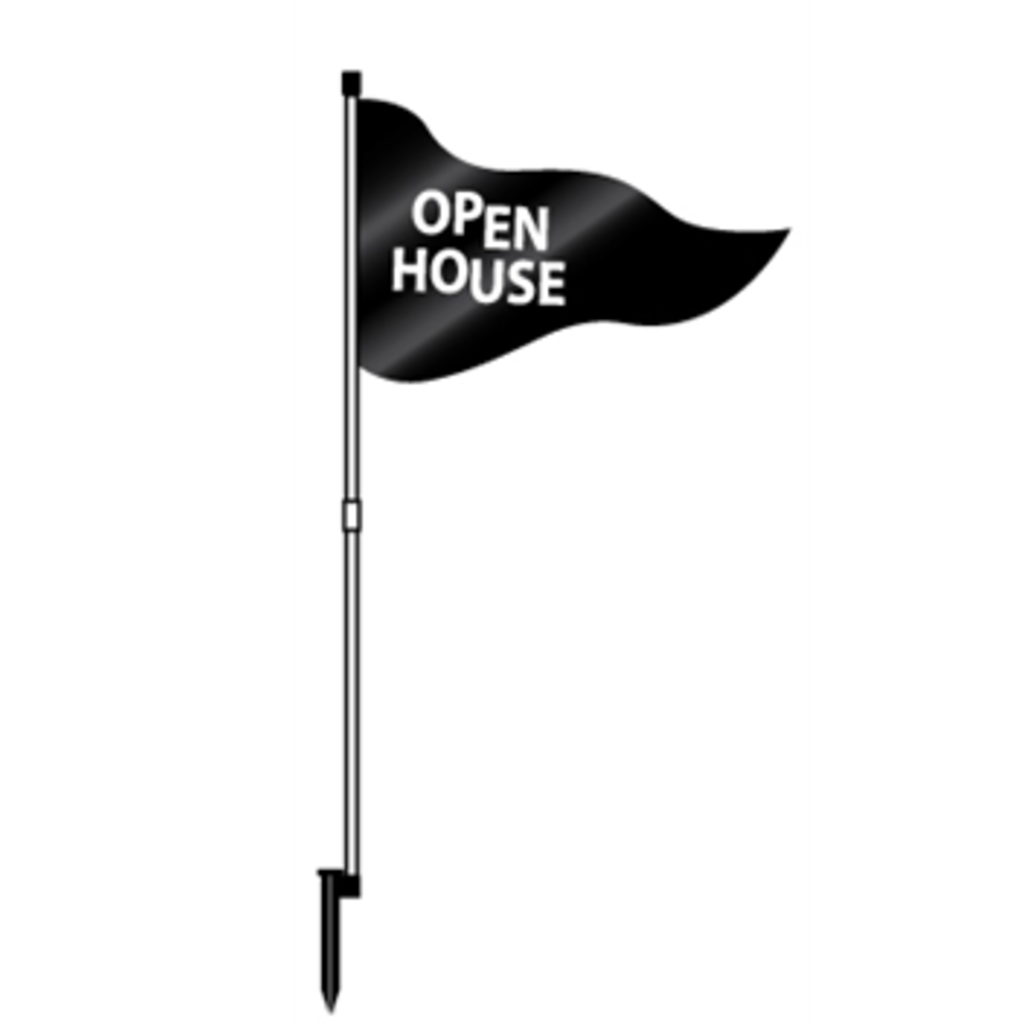 OPEN HOUSE 20" x 30" hemmed, non-fraying nylon pennant flags in red, blue or black on 67" tall round PVC plastic pole. Two-piece pole can be taken apart for easy transport. Cannot ship. Flag also fits on our PVC A-frame.